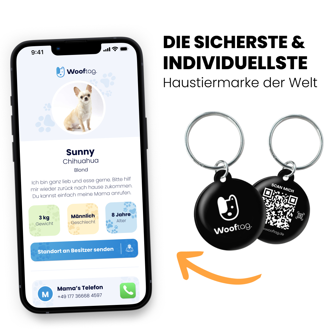 Stell dir vor, dein Hund wird gefunden, aber die Telefonnummer auf seiner alten Gravierten Marke ist nicht mehr lesbar oder die Ziffern sind zerkratzt. Der Finder hat keine Chance, dich zu erreichen. Mit Wooftag genügt ein Scan. In weniger als 3 Sekunden und nur einen Knopfrduck kann jeder finder dich anrufen. Zusätzlich hat der Finder alle Infos sofort auf seinem Handy – keine Missverständnisse, keine verlorene Zeit.